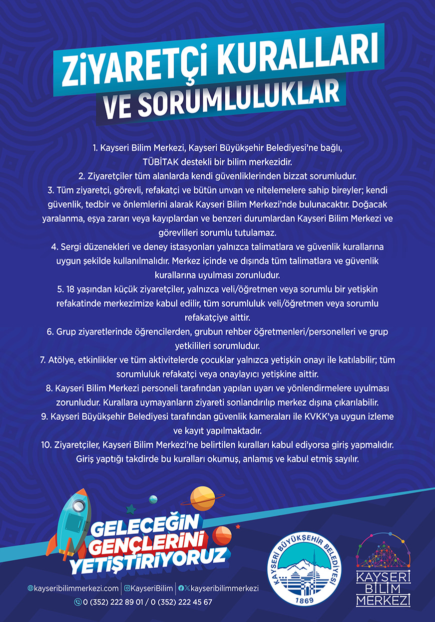 Merkezimiz, 7. Kayseri Bilim Festivali nedeniyle 16.10.2025 - 19.10.2025 tarihleri arasında ziyarete kapalı olacaktır.